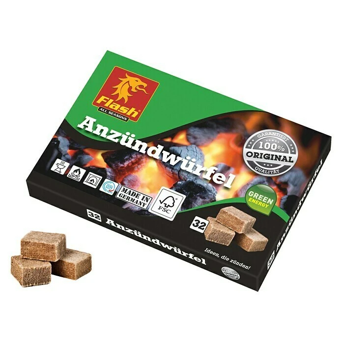 Mit den Anzündwürfeln von Flash heizen Sie richtig ein. Die aus Holz und Wachs bestehenden Anzündwürfel eignen sich zum sicheren und geruchsneutralen Anzünden von Grill, Ofen und Kamin. Die Grillanzünder bestehen zu 100 % aus nachwachsenden Rohstoffen.