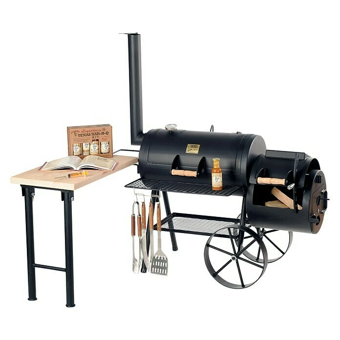 Der Barbeque Smoker Classic von Joe’s Barbeque Smoker ist ein besonders stabiler Grill mit massiven Eisenrädern, der echtes Barbeque-Feeling nach Hause bringt. Der Smoker in rustikaler Optik überzeugt durch viele praktische Details wie etwa einer großen Grillfläche, zwei Ablageflächen, Edelstahl-Grillroste in der Garkammer, Schürhaken oder einem Bimetallthermometer an der Garkammer, sodass hervorragende Grillergebnisse und einzigartige Geschmackserlebnisse besonders leicht erzielt werden. Dank seiner 5 mm starken Stahlblech-Wandung hält der Smoker die Hitze besonders lang.