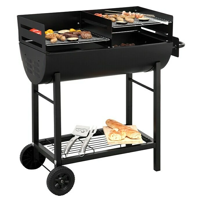 Der Tepro Holzkohlengrill Detroit ist ein echter Allrounder. Er besitzt eine große Grillfläche, auf der mit Leichtigkeit für mehrere Personen gleichzeitig gegrillt werden kann. Nicht nur groß genug für Grillgut von Familie und Freunden, auch bei Veranstaltungen oder auf der Vereinsfeier bietet er ausreichend Grillfläche, um jeden Hungrigen bedienen zu können. Der Ölfassgrill ist deshalb so praktisch und vorteilhaft, weil er auf der einen Seite über Rollen verfügt. Dadurch ermöglicht er flexiblen Grillspaß auf Balkon, Terrasse oder im Garten. Im unteren Bereich des Riesengrills ist eine Ablagefläche angebracht, auf der das Grillwerkzeug abgelegt oder weiterer Grillnachschub gelagert werden kann. Da die Grillfläche in zwei Grillroste geteilt ist, kann unterschiedliches Grillgut separiert voneinander zubereitet werden. Der Windschutz mit dreifacher Grillrosthöhenverstellung ist bestens für eine optimale Steuerung der Grilltemperatur geeignet.