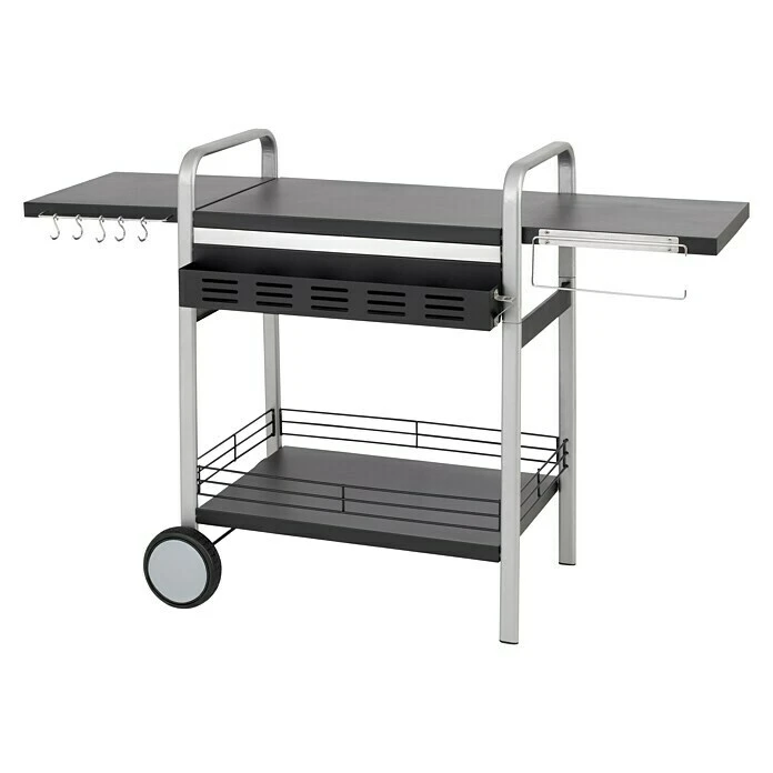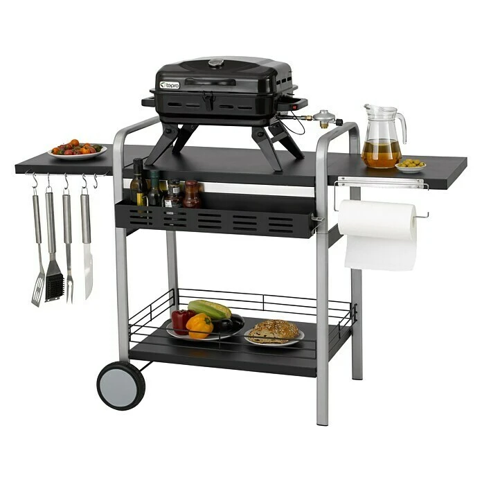 Das Tepro Universal Untergestell ist das Multitalent bim Grillen. Als stabiles Untergestell für zahlreiche Tischgrills tut es ebenso seinen Dienst, wie als Beistell-, Servier- oder Vorbereitungstisch. Die große Arbeitsfläche und die Arbeitshöhe von ca. 91 cm sprechen für den Tisch. Ebenso, das sich viel Zubehör in ihm verstauen lässt. Er besitzt neben der Arbeitsfläche einen Aufbewahrungskorb, mehrere Haken zum Aufhängen von Grillbesteck und einen Handtuch-, bzw. Küchenrollenhalter. Durch seine Räder ist er zudem fahrbar, sodass er im kompletten Garten eingesetzt werden kann.