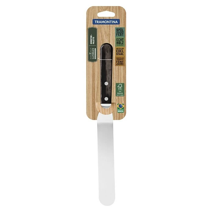 Mit der Streichpalette aus der Tramontina Landhausserie wird das Eindecken, Dekorieren und Verzieren von Torten und Kuchen zum Kinderspiel. Sie ist auch rostfreiem Edelstahl hergestellt und besitzt imprägnierte Holzgriffe. So ist sie leicht, auch in der Spülmaschine, zu reinigen und wird zu einem unverzichtbaren Küchenhelfer.
