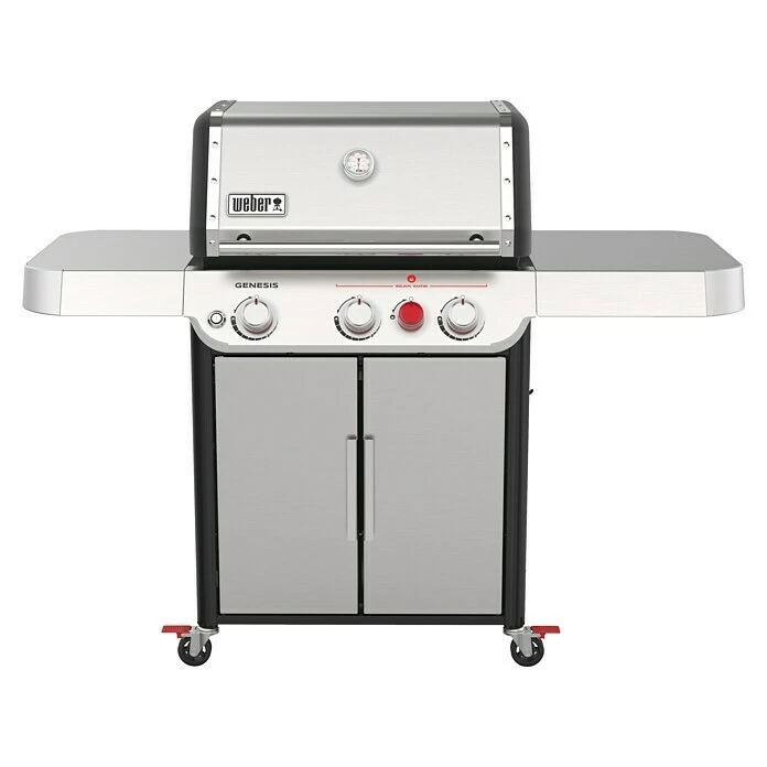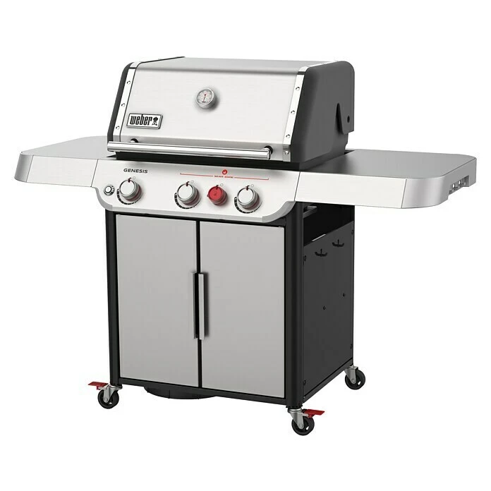 Mit dem Weber Gasgrill Genesis S-325 S sind Sie optimal ausgestattet für den nächsten Grillabend. Die 68 x 48 cm große Grillfläche wird von 3 Edelstahlbrennern mit insgesamt 11,4 kW befeuert, sodass auch das Grillgut mehrerer Gäste gleichzeitig gegrillt werden kann. Zusätzlich lassen sich auf der integrierten 3,8 kW starken Sear Zone Steaks wie im Steakhaus zubereiten. Des weiteren ist das gusseiserne Grillrost mit dem Weber Crafted System kompatibel, sodass es mit vielen Einsätzen erweitert werden kann. So sind die Zubereitungsmöglichkeiten fast endlos. Über ein eingebautes Deckelthermometer lässt sich die Temperatur im Innern des Grills stets im Auge behalten. Die passende Gasflasche, kann problemlos im Unterschrank verstaut werden. Der Großteil des Grills besteht aus hochwertigem Edelstahl, nur der Unterschrank ist teilweise aus lackiertem Stahl gefertigt.