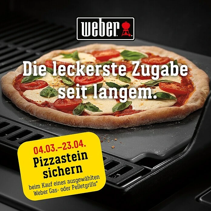 Bei Kauf eines Weber Genesis Aktionsgrills erhalten Sie einen Original Weber Crafted Pizzastein im Wert von 119,99 € (UVP) oder bei Kauf eines Spirit oder Smokefire Aktionsgrills einen Original Weber Crafted GBS Pizzastein im Wert von 73,99 € (UVP) geschenkt. Dafür einfach den, im Aktionszeitraum gekauften, Grill bis zum 21.05.2023 auf www.weber.com registrieren und von Weber den passenden Pizzastein gratis zugesandt bekommen. (Aktion nur solange der Vorrat reicht. Jeder Kassenzettel berechtigt nur zur einmaligen Teilnahme an der Frühlingswochen-Aktion).