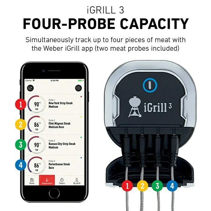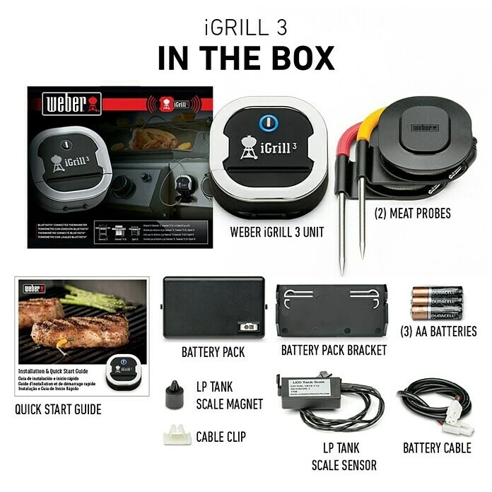 Das Grill-Thermometer iGrill 3 von Weber macht das perfekte Grillen mit dem Gasgrill Genesis II zum Kinderspiel. Über die kostenlose Weber iGrill-App ist eine exakte Kontrolle der Grilltemperatur möglich. Funktionen wie Temperaturbenachrichtigung oder Garzeit-Tracking erlauben ein modernes Grillen mit exakten Grillergebnissen. Das Bluetooth-Grillthermometer verfügt über Anschlussmöglichkeiten für vier Temperaturfühler, sodass das gleichzeitige Garen verschiedener Grillspeisen möglich ist. Ein weiterer Vorteil ist, dass über die Bluetooth-Verbindung eine Anwesenheit direkt am Grill nicht erforderlich ist. So kann sich der Anwender beispielsweise beim langsamen Garen seinen Gästen widmen und wird doch rechtzeitig an das Grillgut erinnert. Im Lieferumfang sind zwei Temperaturfühler enthalten, zusätzlich können zwei weitere Fühler angeschlossen werden.