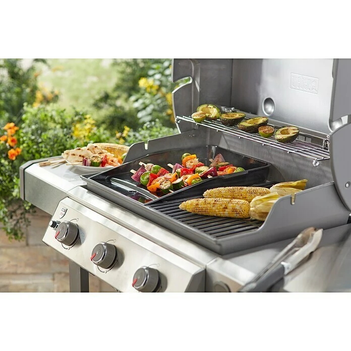 Die Weber Grillplatte Plancha ist aus porzellanemailliertem Gusseisen gefertigt und passend für die Weber Gasgrills Genesis II ab der 300-Serie. Sie eignet sich perfekt für die Zubereitung von Fisch, Gambas, Gemüse, frischen Omeletts, Pfannkuchen und French Toasts. Das Gusseisen verteilt die Hitze gleichmäßig und speichert die Wärme. Durch die geneigte Grillfläche kann Bratensaft ohne Mühe abgegossen werden. Die Emaillierung sorgt für eine besonders einfache Reinigung.